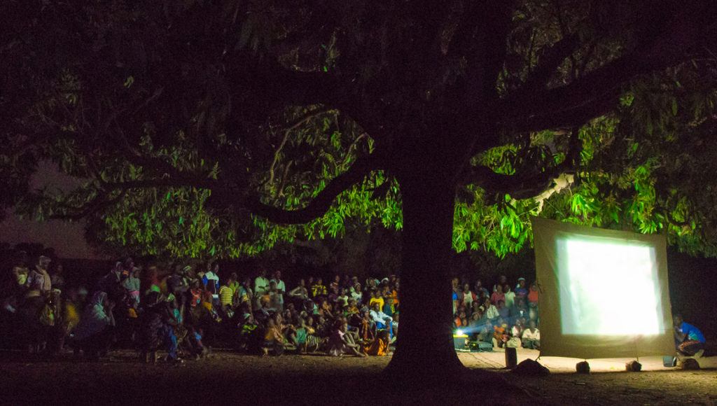 Light into the Darkness Men, women, and children gather in the center of their village to watch the Jesus film being shown under a mango